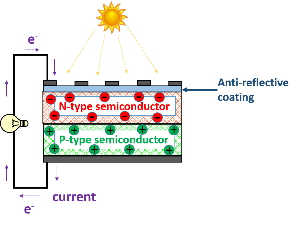 When light shines on the device, the anti-reflective coating layer traps the absorbed sunlight to maximize device performance. The semiconductor absorbs the trapped light and releases electrons. Electrons collect in the negatively charged layer of the semiconductor region and ‘holes’ (a name for the absence of electrons), collect in the positively charged layer. Therefore, when an electric load is connected to either end of the device, electrons flow from the positive electrode to the negative electrode completing the circuit!